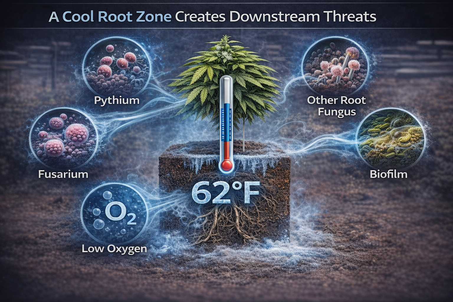 A cold, wet, under-oxygenated root zone is one of the most common upstream conditions that supports poor root health and microbial opportunity. Proper root-zone management content emphasizes that oxygen availability, water management, and microbial balance are core to plant resilience. That lines up with what cultivators see in the field: when root zones become biologically stagnant, canopy symptoms often show up later and get misdiagnosed as nutrition, irrigation timing, or "tired" genetics.