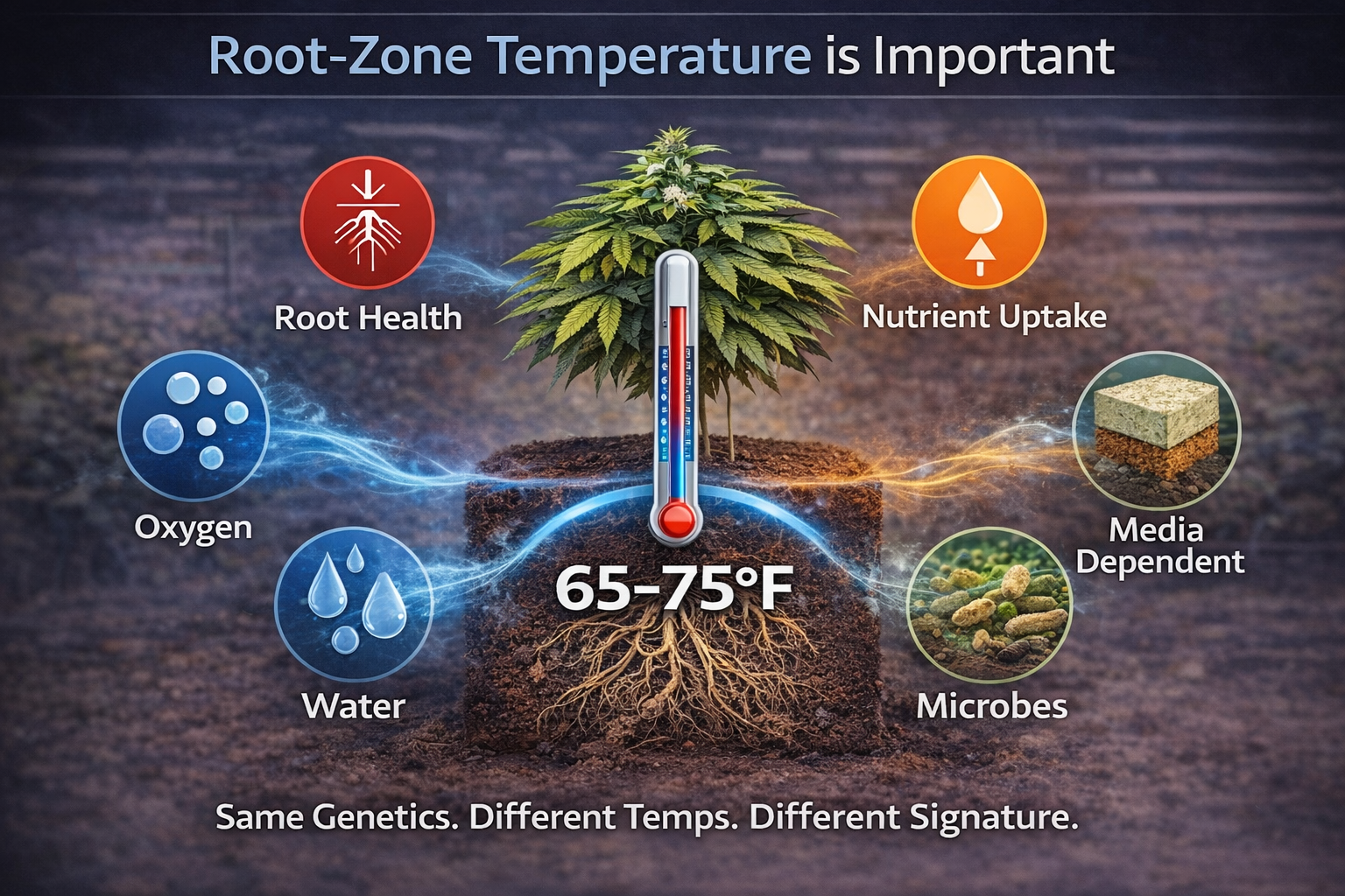 Root-zone temperature is one of the most under-managed levers in indoor cannabis, and it touches nearly everything growers care about: root growth, dryback behavior, oxygen availability, nutrient uptake, microbial pressure, plant confidence, and the consistency of expression room to room and table to table. Crop-steering guidance from AROYA puts root-zone temperature alongside water content, EC, and oxygen availability as a core variable in effective root-zone management, and they cite a practical target band of roughly 65–75°F (18–24°C) for nutrient absorption and root metabolism.