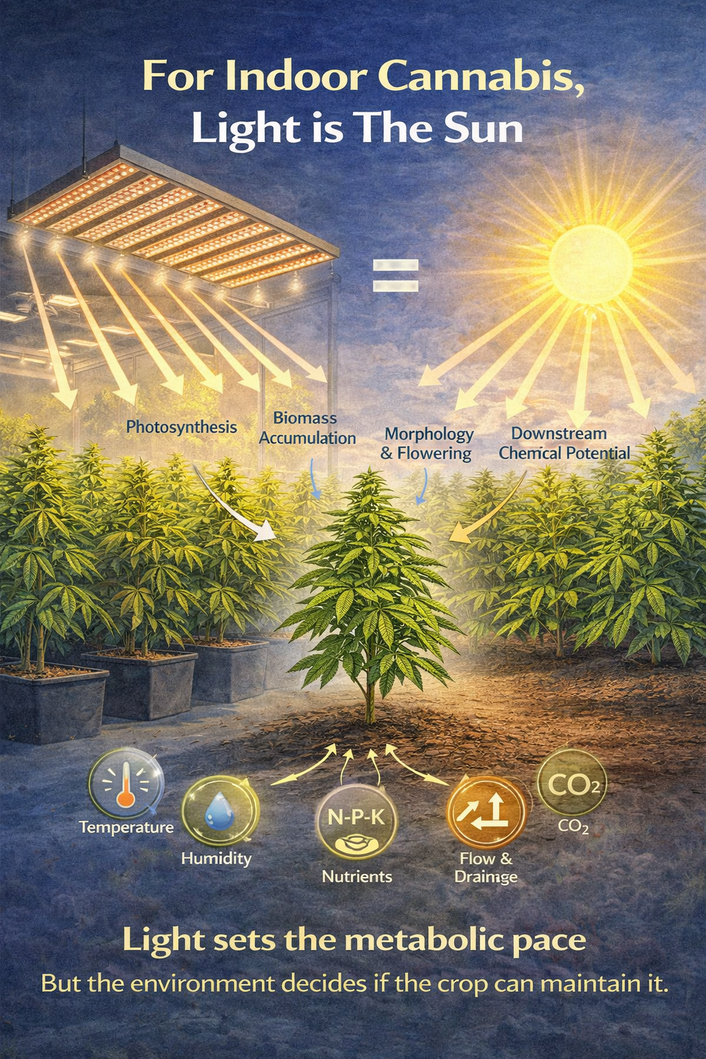 In indoor cannabis, light is the sun. That sounds obvious, but it is the right place to start because light is not just another input. It is the primary energy source driving photosynthesis, biomass accumulation, morphology, flowering signals, transpiration demand, and much of the downstream chemical potential of the crop. That makes light one of the most powerful terroir variables in a controlled environment. It is visible, measurable, expensive, and emotionally persuasive, which is exactly why it is so often oversimplified. More light usually means more yield, but only to the point that temperature, humidity, CO₂, airflow, root-zone function, and fertigation can keep up. Cannabis-specific studies now support that basic principle strongly. Indoor-grown cannabis has shown near-proportional yield increases with higher light intensity over large ranges and has shown that very high light can increase inflorescence yield and total specialized metabolite yield when the rest of the system is not limiting.