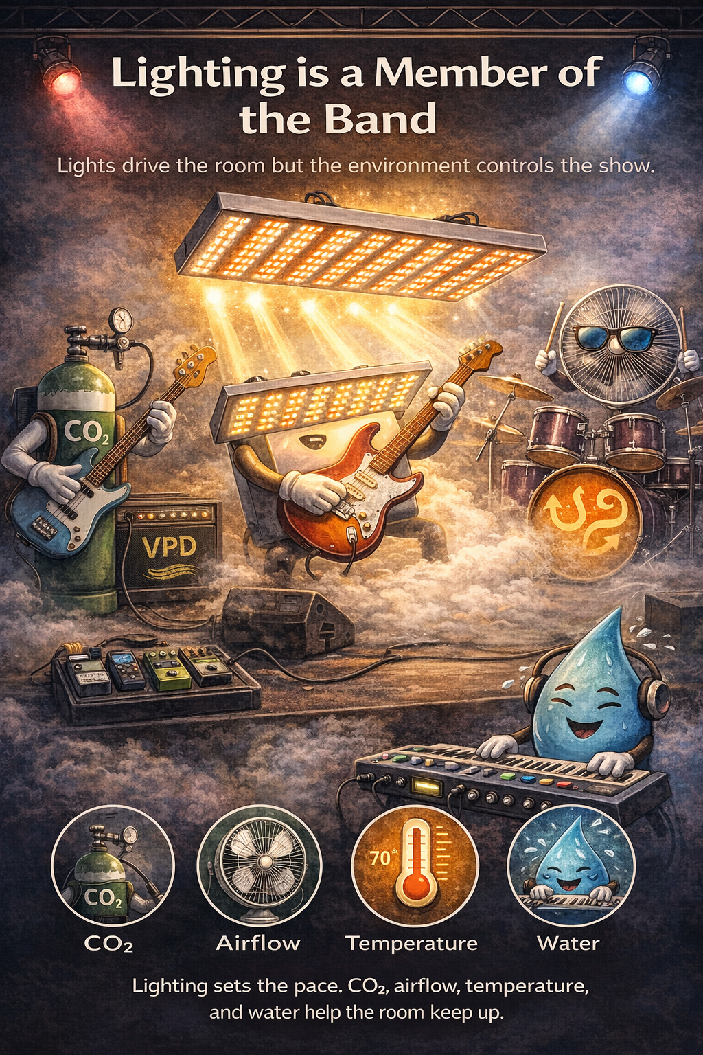 Light feels like it should be the master variable because it is visible. Growers can stand in a room and feel its presence. But the strongest science and the best commercial experience both say the same thing: lighting only drives as hard as the room can support. High PPFD without good airflow leaves CO₂ stranded outside the boundary layer. High DLI without enough latent removal leaves the crop hydraulically bottlenecked. Strong spectra without temperature discipline create morphology you did not intend. More photons without root-zone capacity create stress rather than throughput.